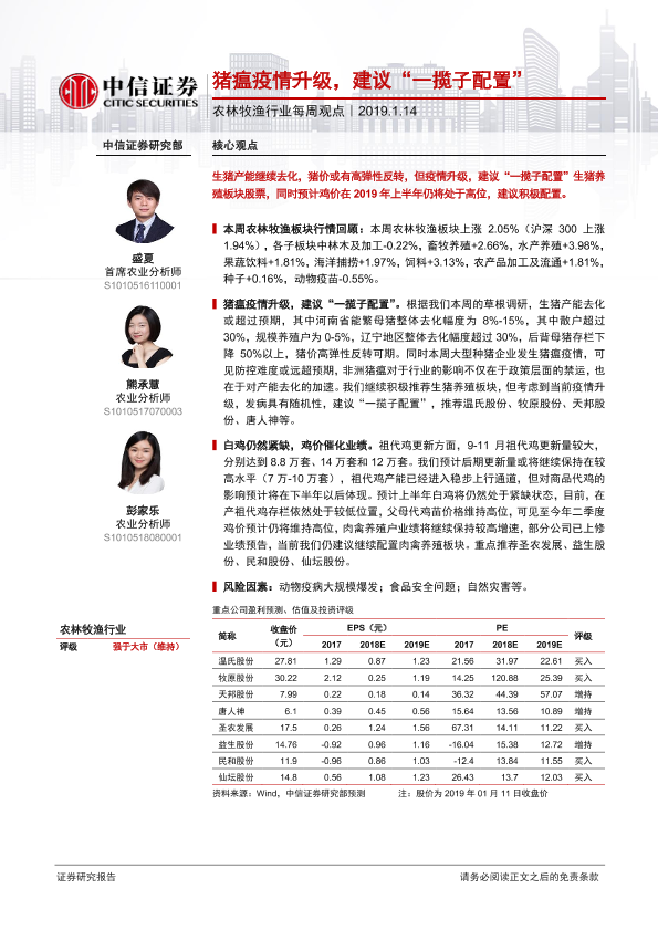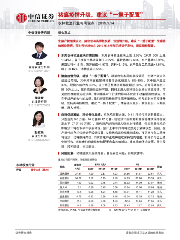 【中信证券】【20190114】20190114-中信证券-农林牧渔行业每周观点:猪瘟疫情升级,建议“一揽子配置”-6页
