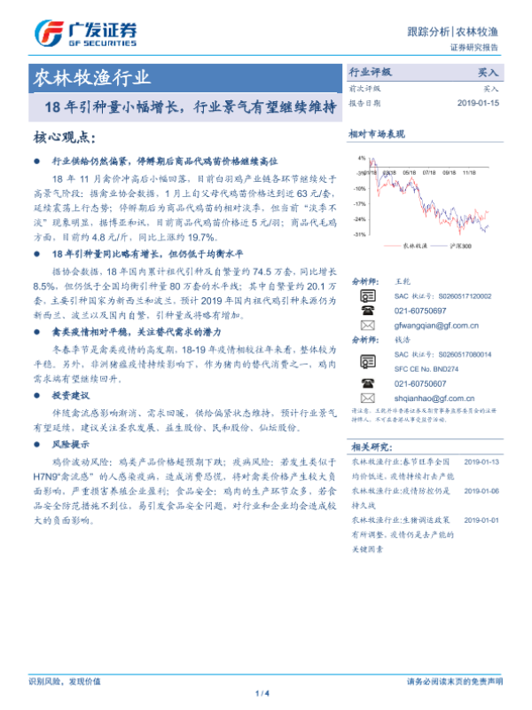 农林牧渔 引种量 替代需求 行业景气 鸡苗价格