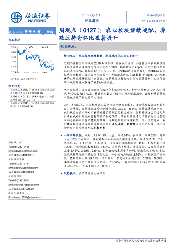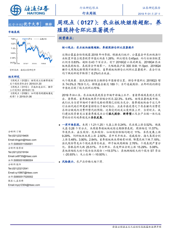 【海通证券】【20190127】农业周观点(0127):农业板块继续超配,养殖股持仓环比显著提升-6页