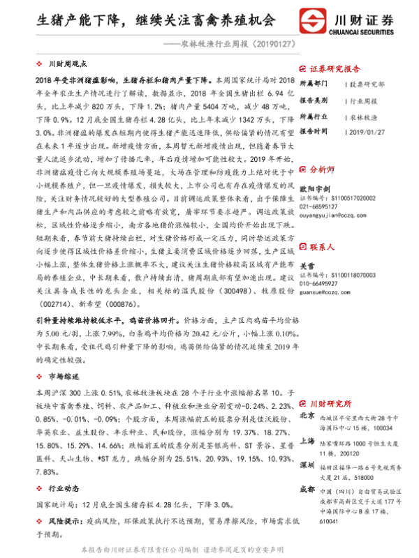 【川财证券】【20190127】20190127-川财证券-农林牧渔行业周报:生猪产能下降,继续关注畜禽养殖机会-12页