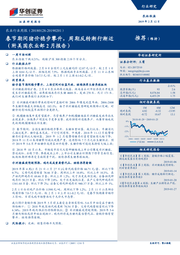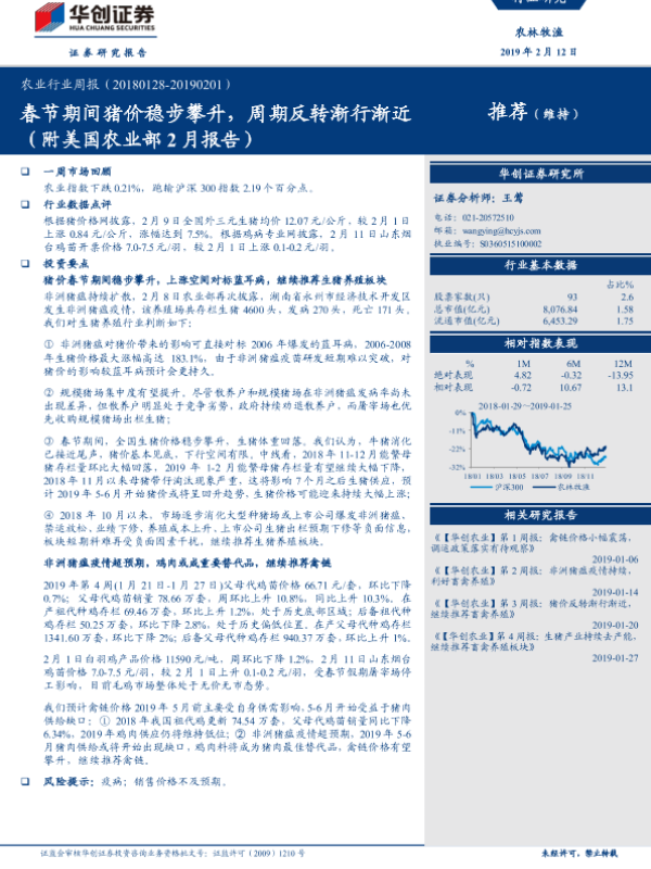【华创证券】【20190212】20190212-华创证券-农业行业周报:春节期间猪价稳步攀升,周期反转渐行渐近推荐(维持)(附美国农业部2月报告)-28页