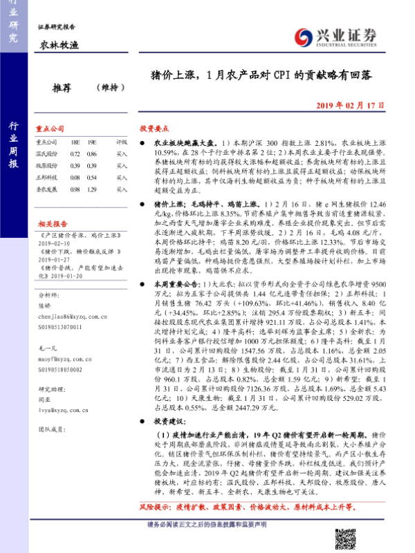 【兴业证券】【20190217】20190217-兴业证券-农林牧渔行业周报:猪价上涨,1月农产品对CPI的贡献略有回落-15页