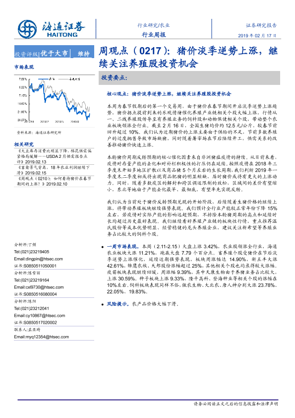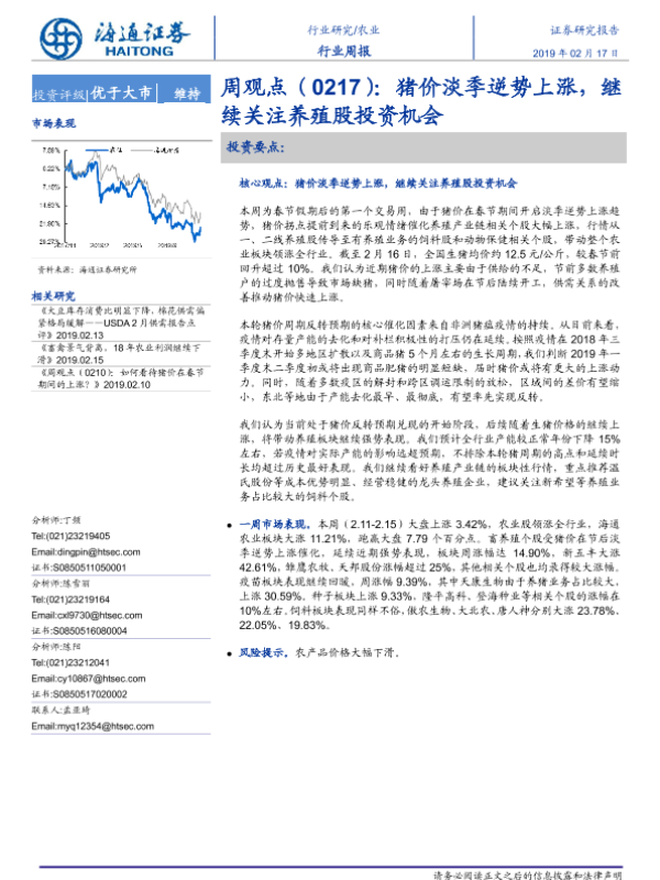 【海通证券】【20190217】农业周观点:猪价淡季逆势上涨,继续关注养殖股投资机会-4页
