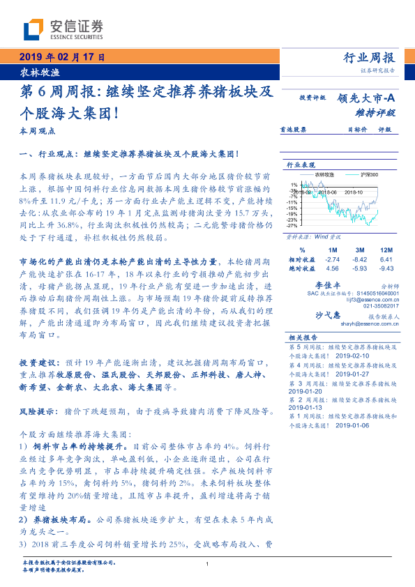 【安信证券】【20190217】20190217-安信证券-农林牧渔行业第6周周报:继续坚定推荐养猪板块及个股海大集团!-12页