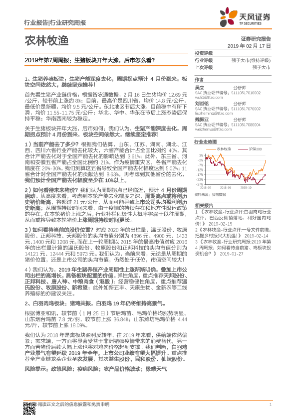 【天风证券】【20190217】农林牧渔2019年第7周周报:生猪板块开年大涨,后市怎么看?-14页