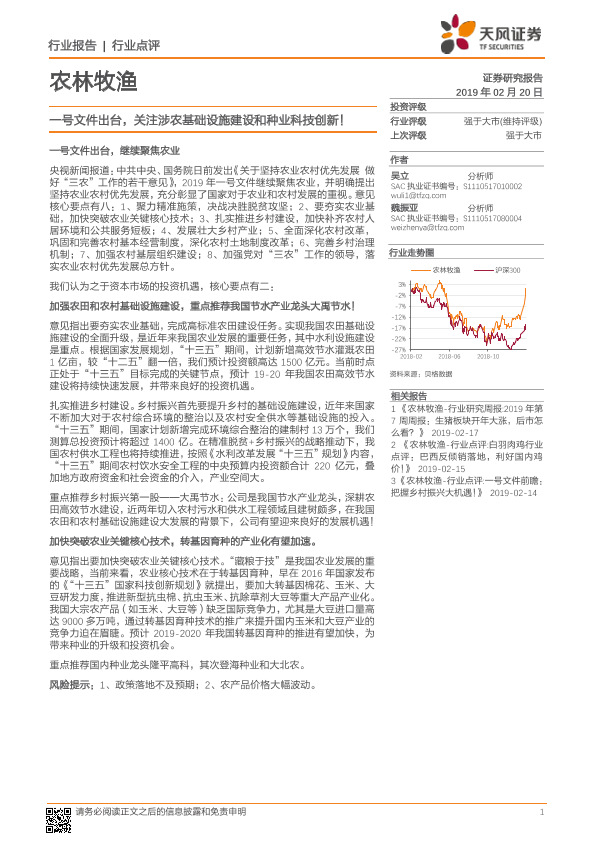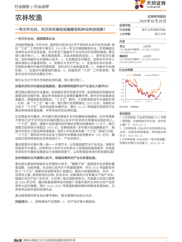 【天风证券】【20190220】20190220-天风证券-农林牧渔行业点评:一号文件出台,关注涉农基础设施建设和种业科技创新!-2页