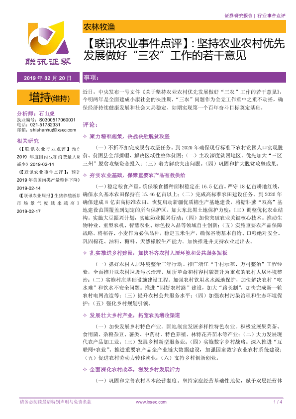 【粤开证券】【20190220】关于坚持农业农村优先发展做好“三农”工作的若干意见-4页