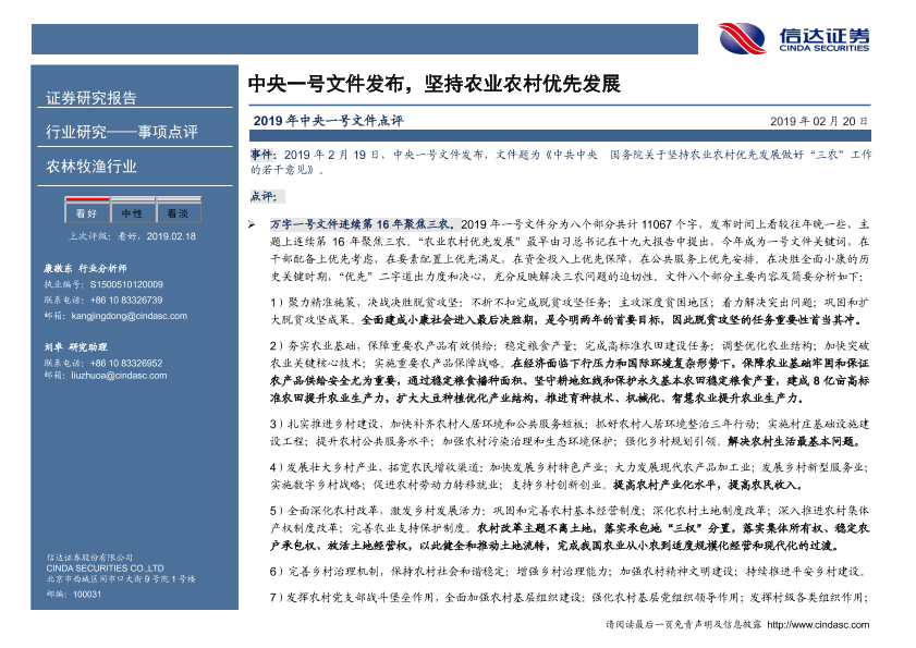 【信达证券】【20190220】2019年中央一号文件点评:中央一号文件发布,坚持农业农村优先发展-5页
