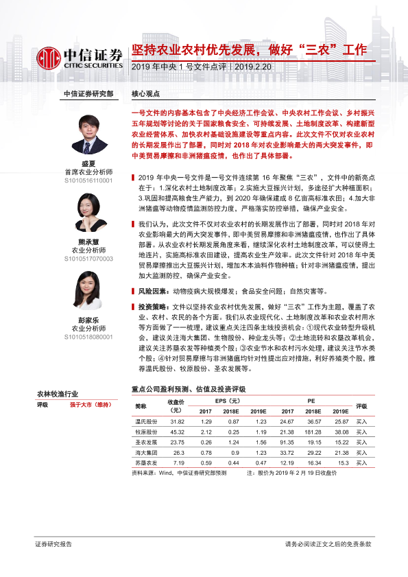 【中信证券】【20190220】2019年中央1号文件点评:坚持农业农村优先发展,做好“三农”工作-7页
