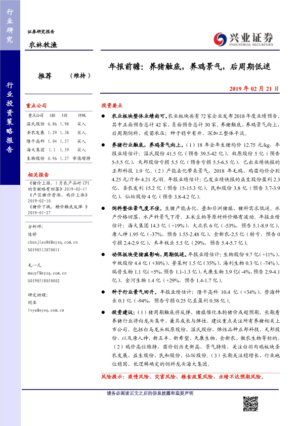 【兴业证券】【20190221】年报前瞻:养猪触底,养鸡景气,后周期低迷-15页