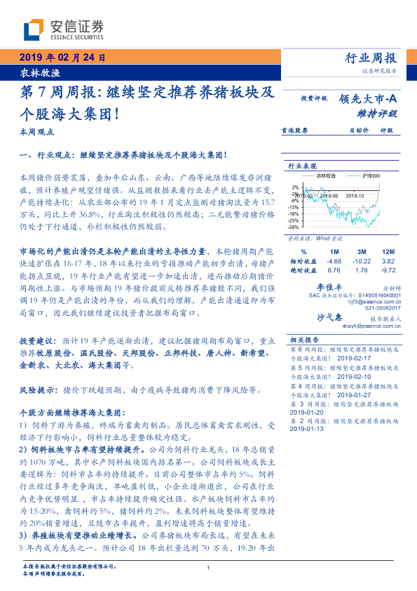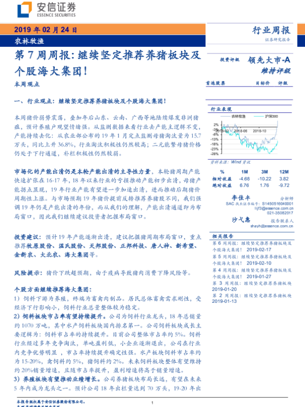 【安信证券】【20190224】20190224-安信证券-农林牧渔第7周周报:继续坚定推荐养猪板块及个股海大集团!-12页
