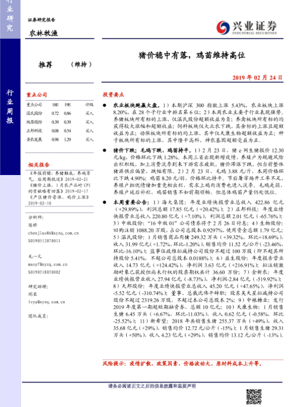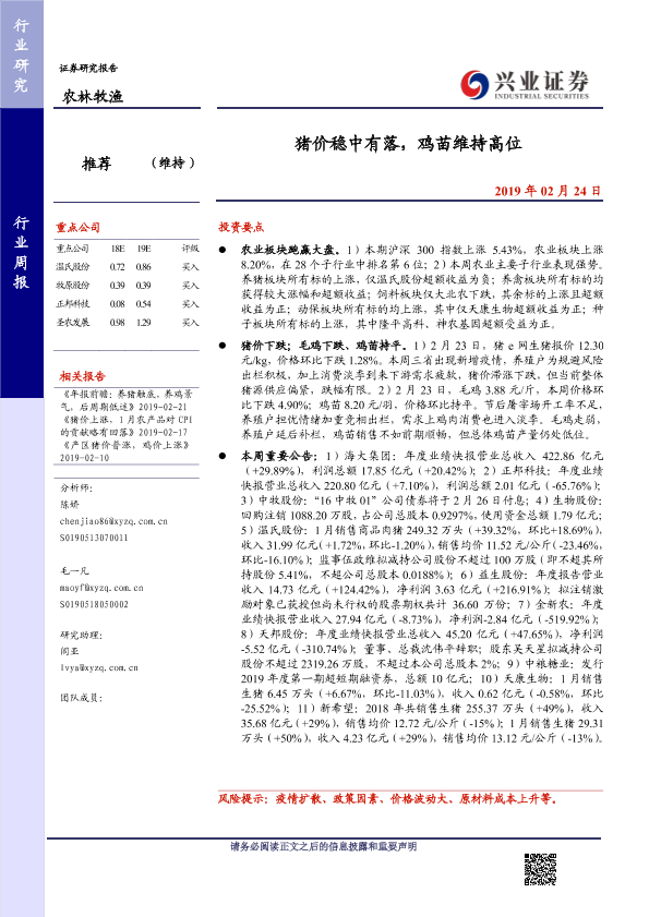 【兴业证券】【20190224】20190224-兴业证券-农林牧渔行业周报:猪价稳中有落,鸡苗维持高位-15页