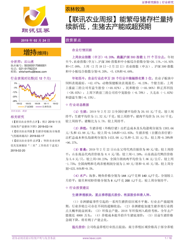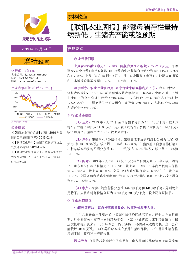 【粤开证券】【20190224】【联讯农业周报】能繁母猪存栏量持续新低,生猪去产能或超预期-16页