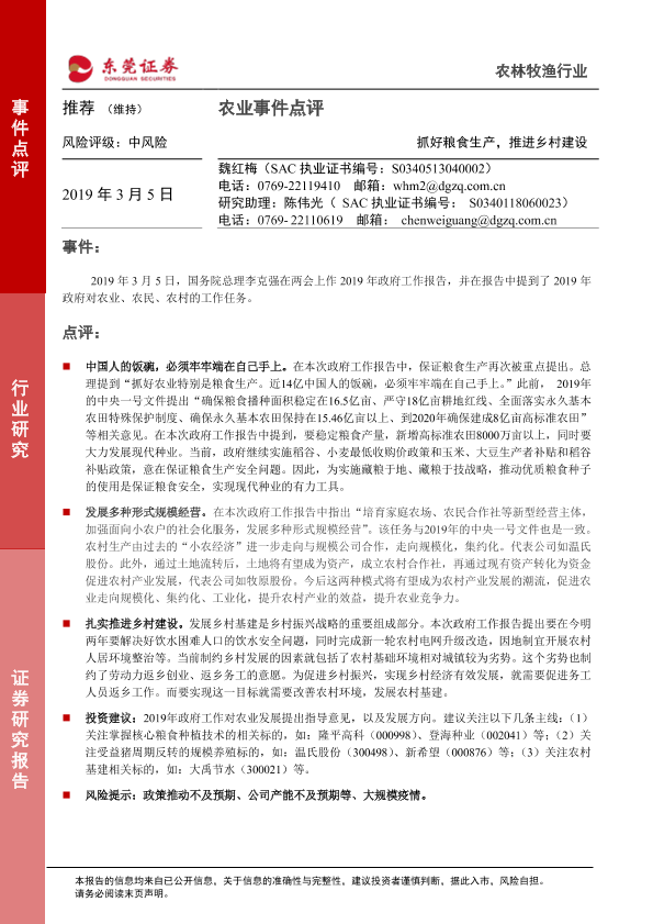【东莞证券】【20190305】农业事件点评:抓好粮食生产,推进乡村建设-2页