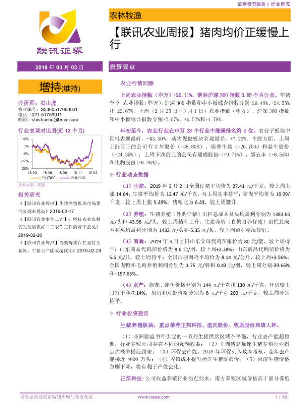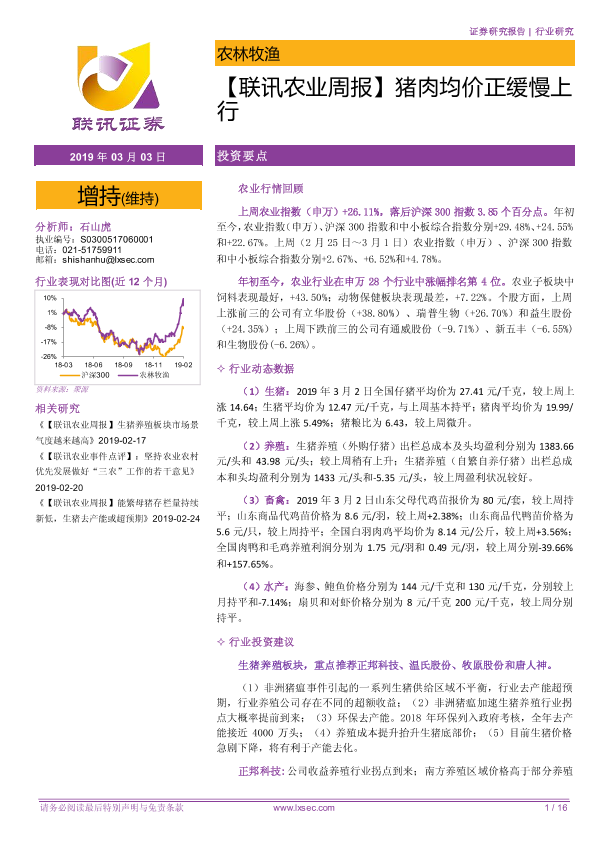 【粤开证券】【20190303】【联讯农业周报】猪肉均价正缓慢上行-16页