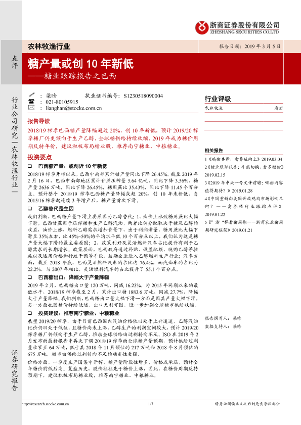 【浙商证券】【20190305】糖业跟踪之巴西:糖产量或创10年新低-7页
