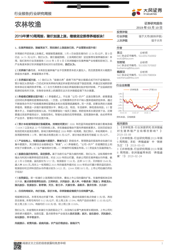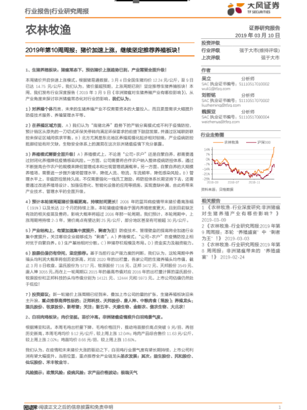 【天风证券】【20190310】农林牧渔行业2019年第10周周报:猪价加速上涨,继续坚定推荐养殖板块!-14页