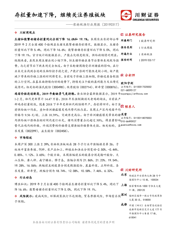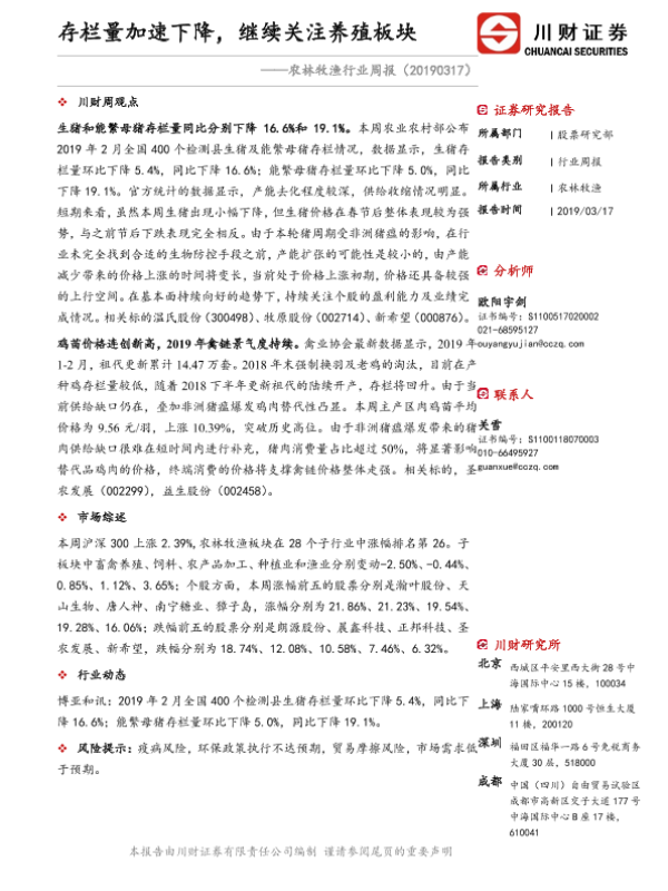 【川财证券】【20190317】20190317-川财证券-农林牧渔行业周报:存栏量加速下降,继续关注养殖板块-12页
