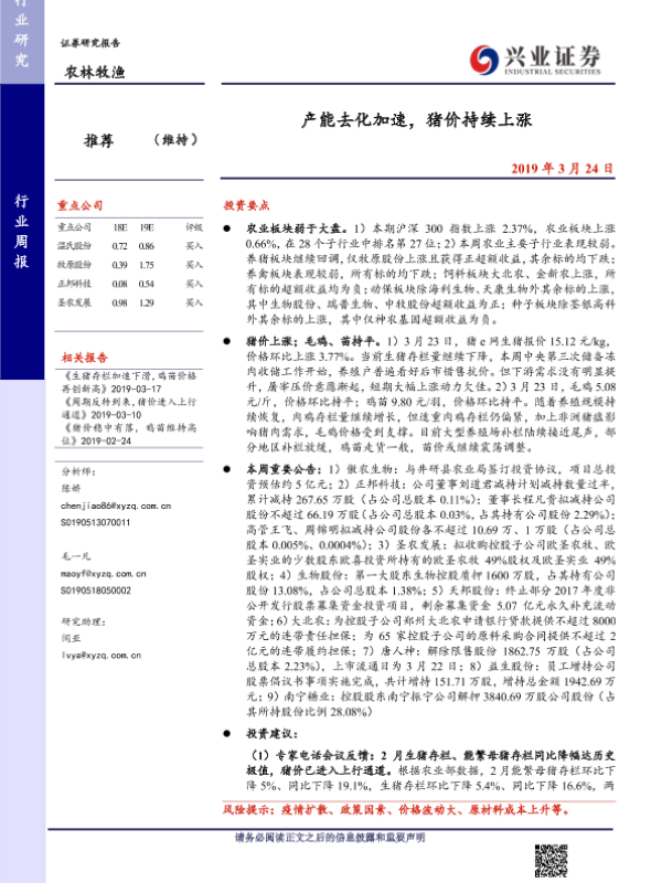 【兴业证券】【20190324】20190324-兴业证券-农林牧渔行业周报:产能去化加速,猪价持续上涨-15页