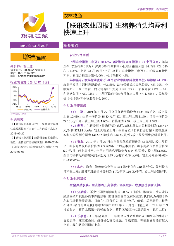 【粤开证券】【20190325】【联讯农业周报】生猪养殖头均盈利快速上升-17页