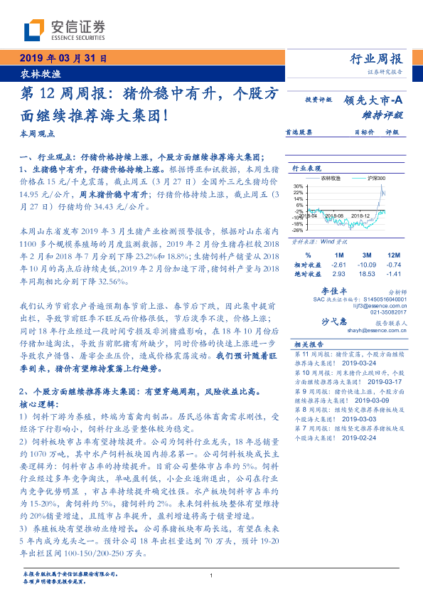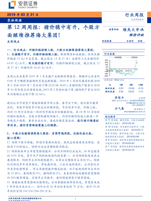 【安信证券】【20190331】20190331-安信证券-农林牧渔第12周周报:猪价稳中有升,个股方面继续推荐海大集团!-12页