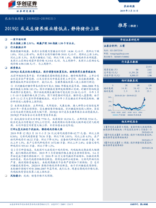 【华创证券】【20190331】20190331-华创证券-农业行业周报:2019Q1或成生猪养殖业绩低点,静待猪价上涨-22页