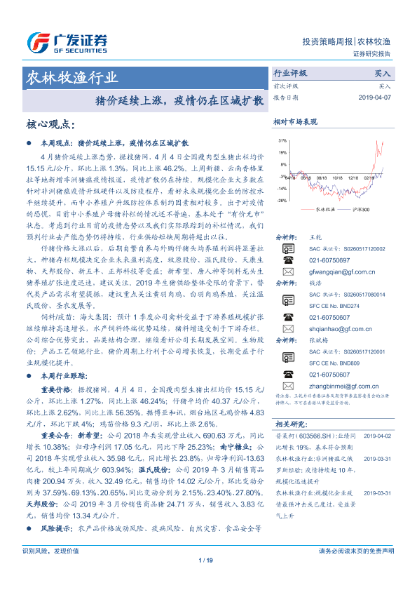 【广发证券】【20190407】农林牧渔行业投资策略周报:猪价延续上涨,疫情仍在区域扩散-19页