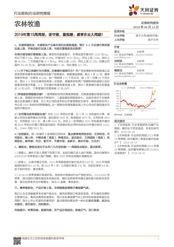 【天风证券】【20190414】20190414-天风证券-农林牧渔2019年第15周周报:坚守猪,重视糖:盛享农业大周期!-14页