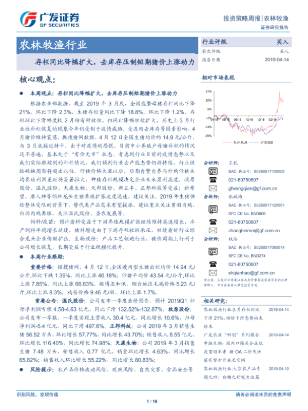 【广发证券】【20190414】农林牧渔行业投资策略周报:存栏同比降幅扩大,去库存压制短期猪价上涨动力-19页