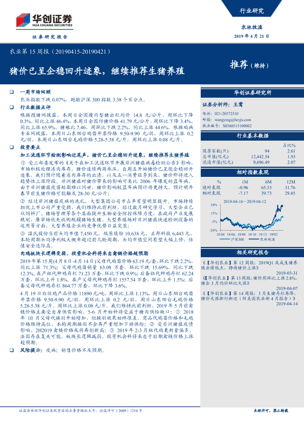 【华创证券】【20190421】农业第15周报:猪价已呈企稳回升迹象,继续推荐生猪养殖-23页