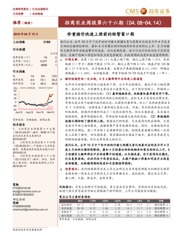 【海通证券】【20190415】招商农业周报第六十六期:珍重猪价快速上涨前的短暂窗口期-26页