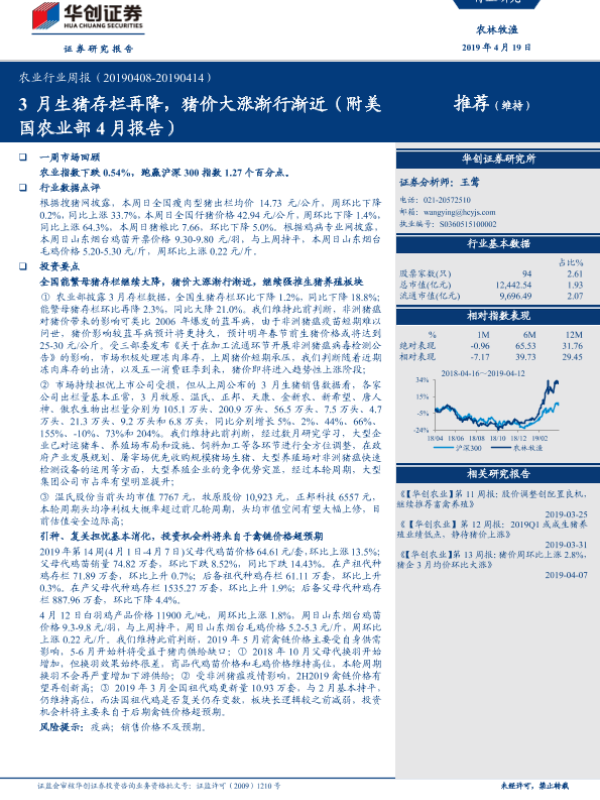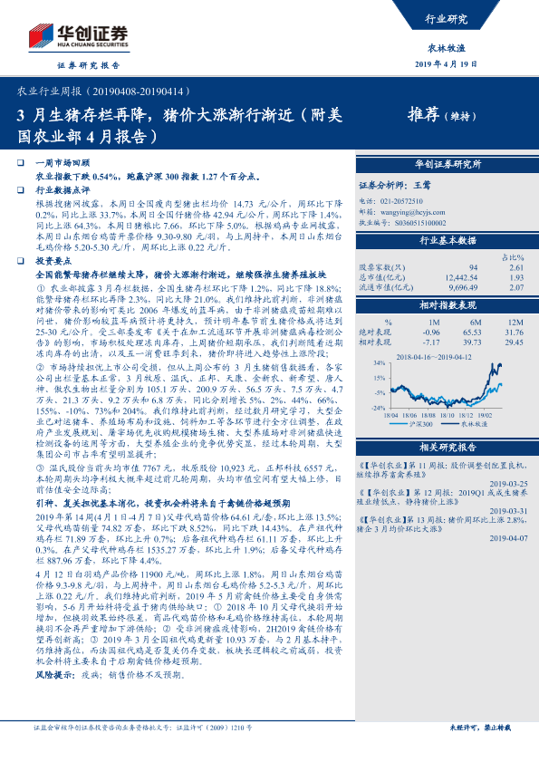 【华创证券】【20190419】20190419-华创证券-农业行业周报:3月生猪存栏再降,猪价大涨渐行渐近(附美国农业部4月报告)-28页