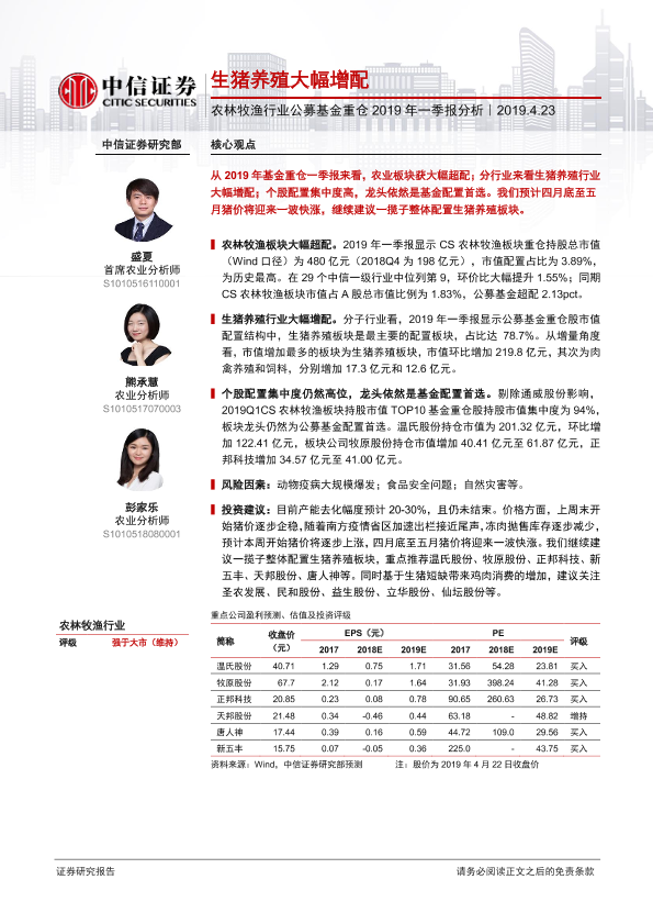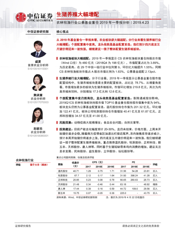 【中信证券】【20190423】农林牧渔行业公募基金重仓2019年一季报分析:生猪养殖大幅增配-6页