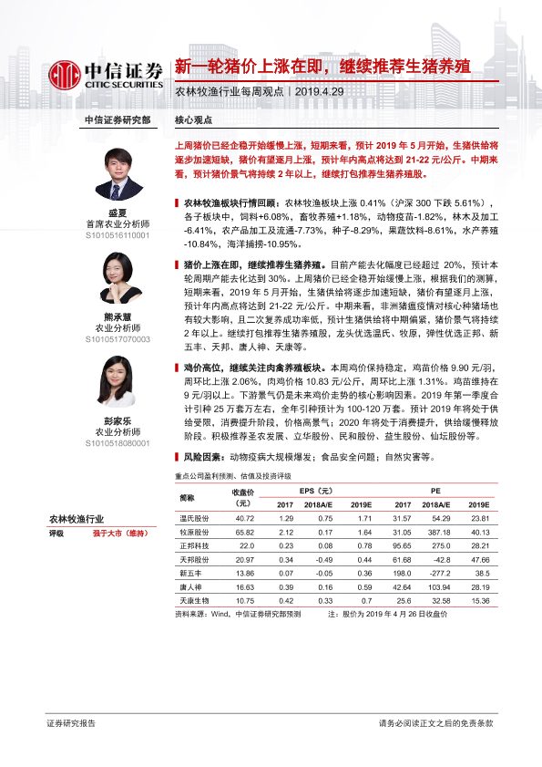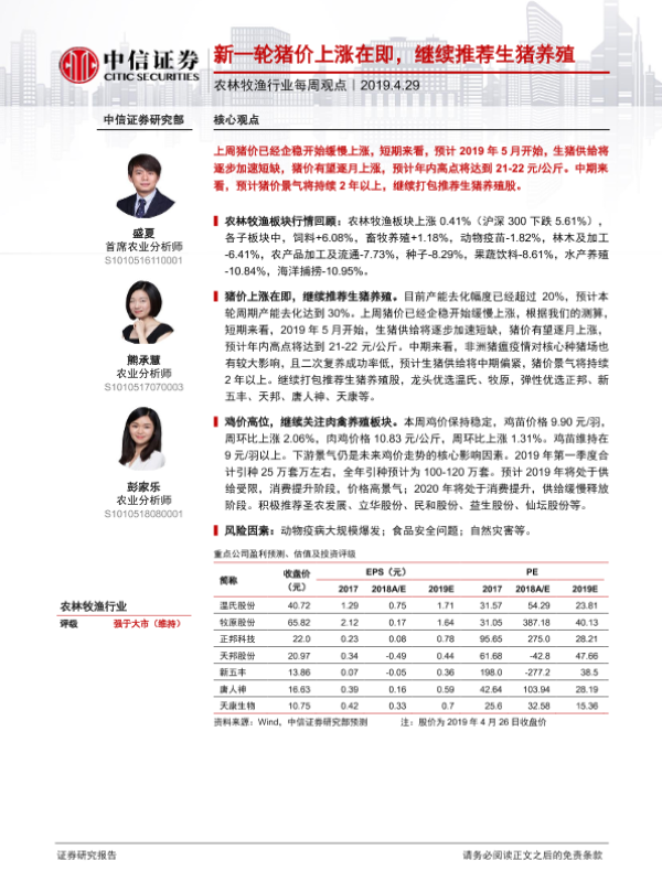 【中信证券】【20190429】20190429-中信证券-农林牧渔行业每周观点:新一轮猪价上涨在即,继续推荐生猪养殖-6页