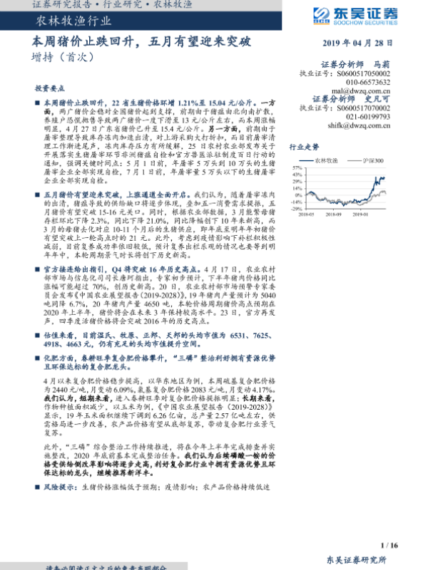 【东吴证券】【20190428】20190428-东吴证券-农林牧渔行业:本周猪价止跌回升,五月有望迎来突破-16页