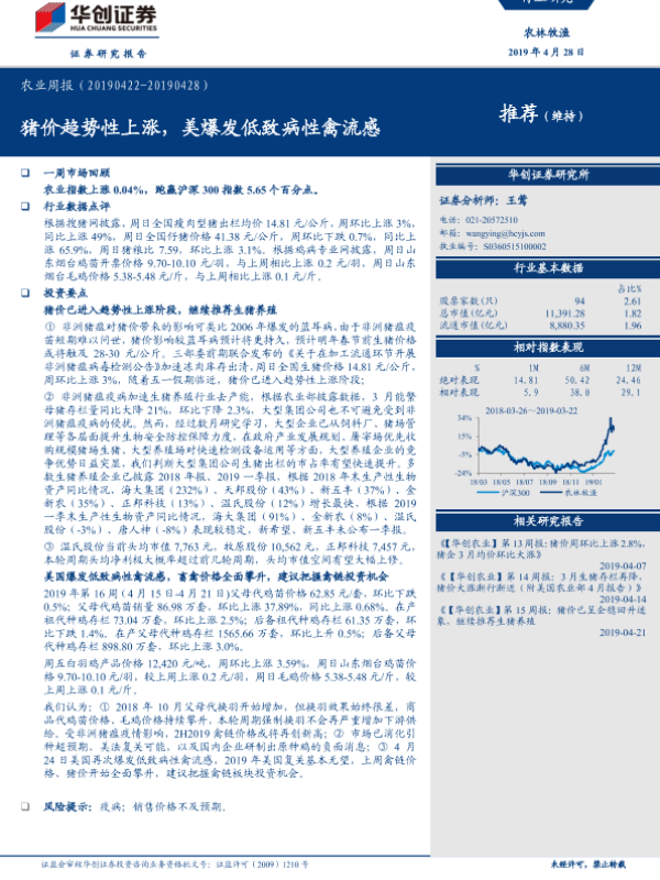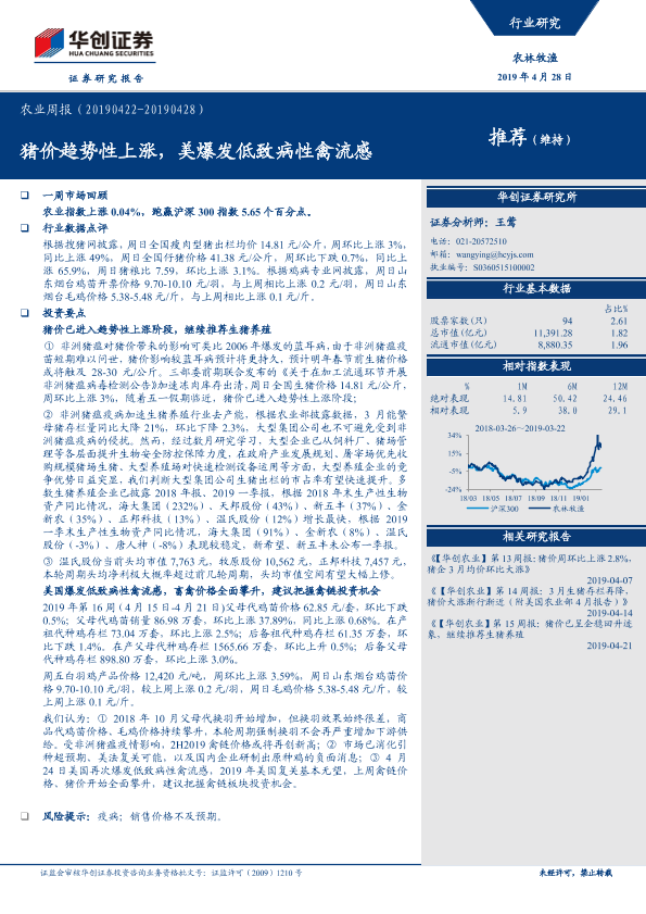 【华创证券】【20190428】20190428-华创证券-农业周报:猪价趋势性上涨,美爆发低致病性禽流感-24页