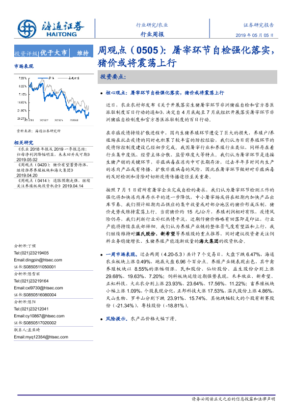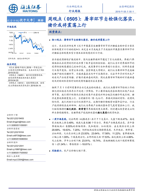 【海通证券】【20190505】农业周观点:屠宰环节自检强化落实,猪价或将震荡上行-4页