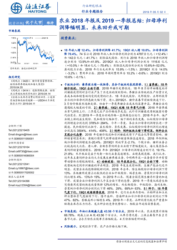 【海通证券】【20190502】农业2018年报及2019一季报总结:归母净利润降幅明显,未来回升或可期-21页