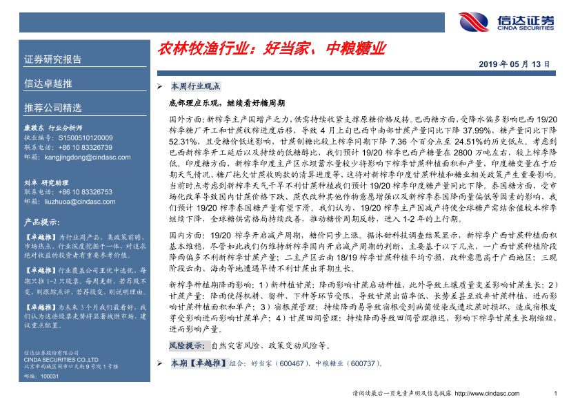 【信达证券】【20190513】农林牧渔行业:好当家、中粮糖业-6页