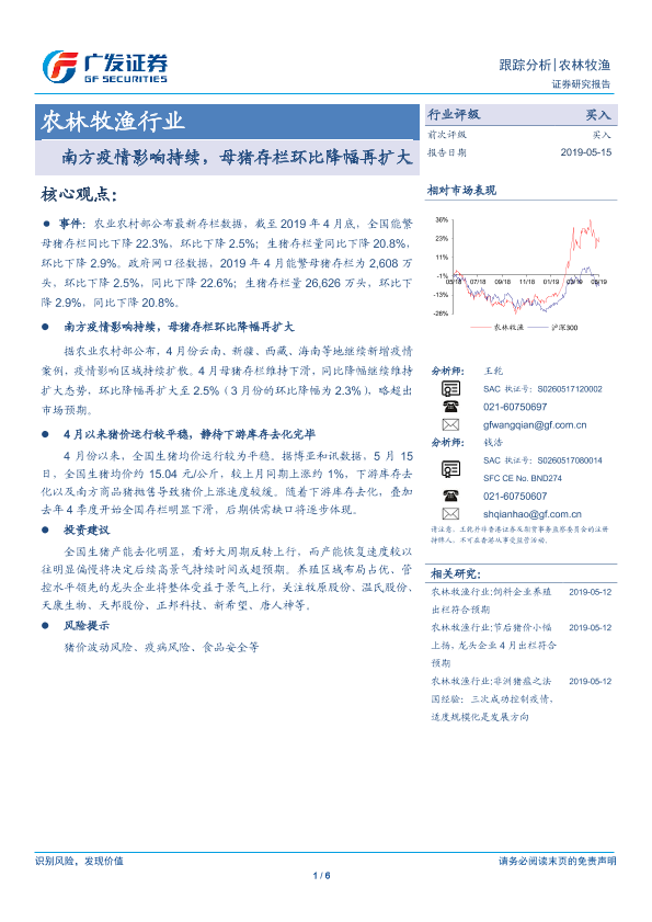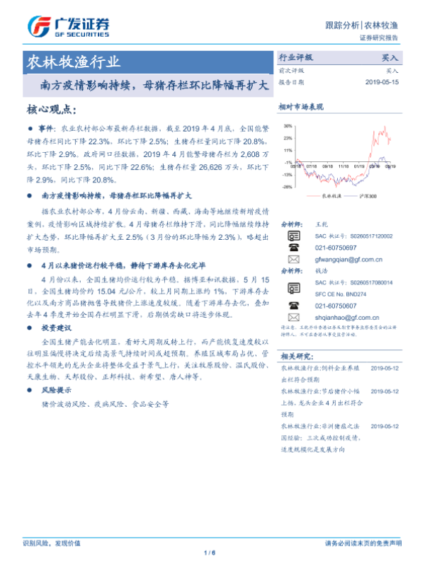 【广发证券】【20190515】农林牧渔行业跟踪分析:南方疫情影响持续,母猪存栏环比降幅再扩大-6页