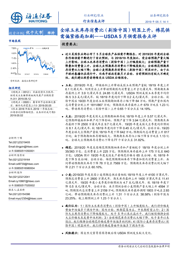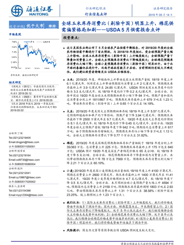 【海通证券】【20190514】农业:USDA5月供需报告点评:全球玉米库存消费比(剔除中国)明显上升,棉花供需偏紧格局加剧-7页