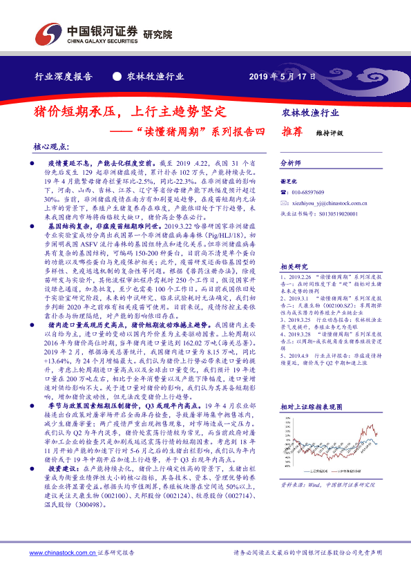 【银河证券】【20190517】“读懂猪周期”系列报告四:猪价短期承压,上行主趋势坚定-15页