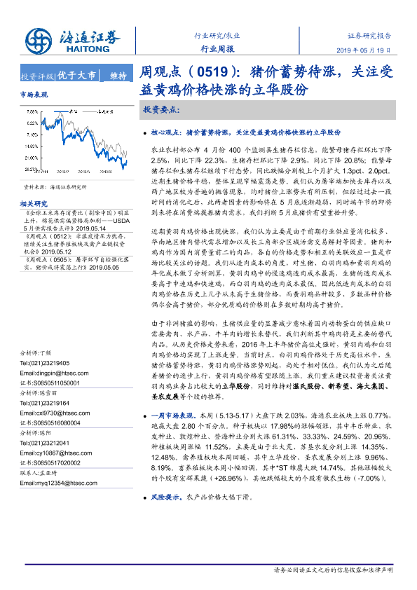 【海通证券】【20190519】农业周观点(0519):猪价蓄势待涨,关注受益黄鸡价格快涨的立华股份-4页
