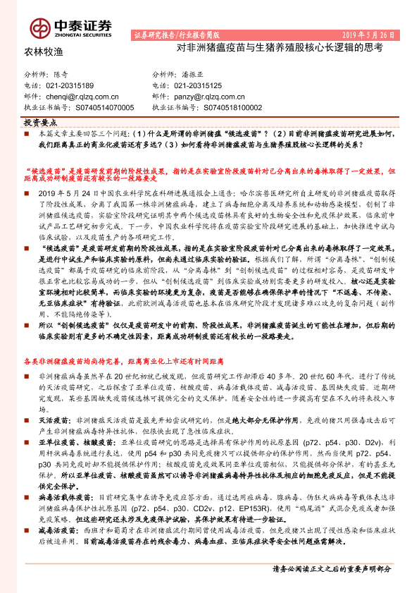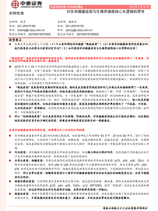 【中泰证券】【20190526】对非洲猪瘟疫苗与生猪养殖股核心长逻辑的思考-11页