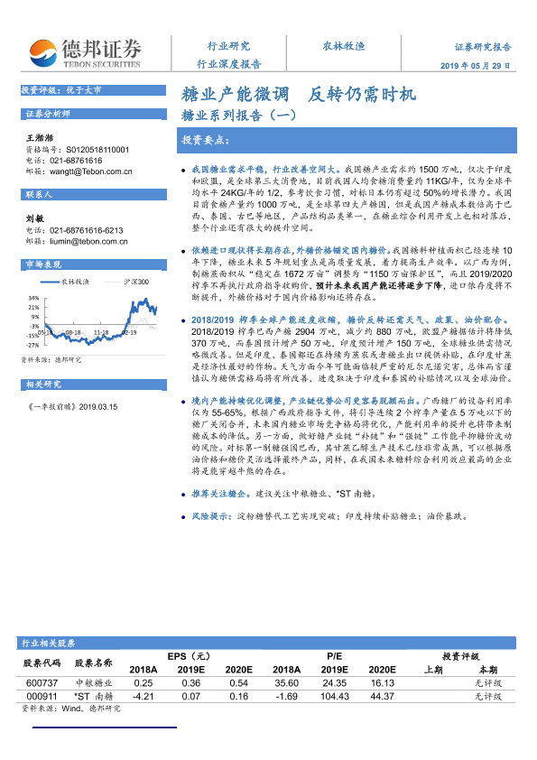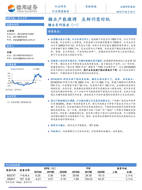 【德邦证券】【20190529】农林牧渔行业深度报告:糖业系列报告(一)-糖业产能微调 反转仍需时机-26页