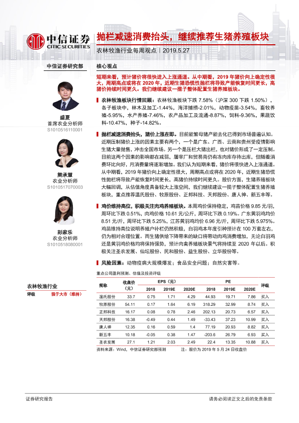 【中信证券】【20190527】20190527-中信证券-农林牧渔行业每周观点:抛栏减速消费抬头,继续推荐生猪养殖板块-6页