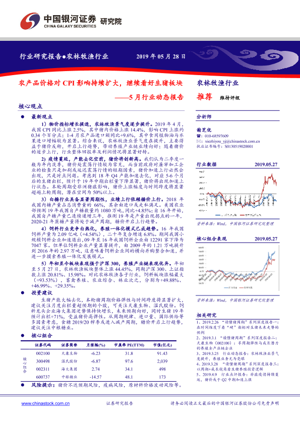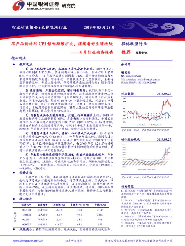 【银河证券】【20190528】20190528-中国银河-农林牧渔5月行业动态报告:农产品价格对CPI影响持续扩大,继续看好生猪板块-17页