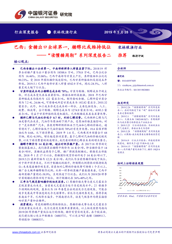 【银河证券】【20190528】农林牧渔行业:“读懂糖周期”系列深度报告二:巴西:食糖出口全球第一,糖醇比或维持低位-21页