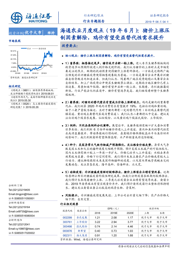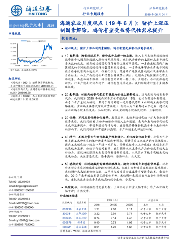 【海通证券】【20190604】海通农业月度观点(19年6月):猪价上涨压制因素解除,鸡价有望受益替代性需求提升-21页