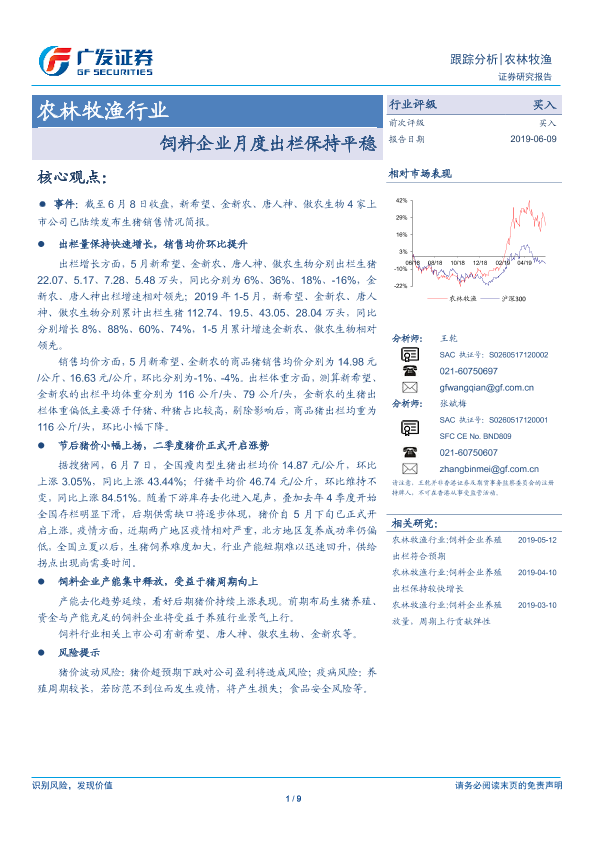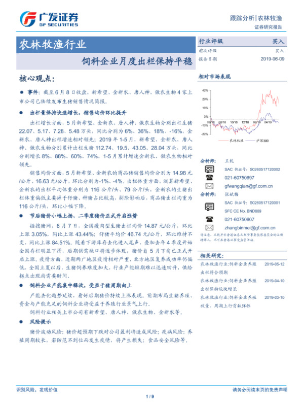 【广发证券】【20190609】农林牧渔行业跟踪分析:饲料企业月度出栏保持平稳-9页